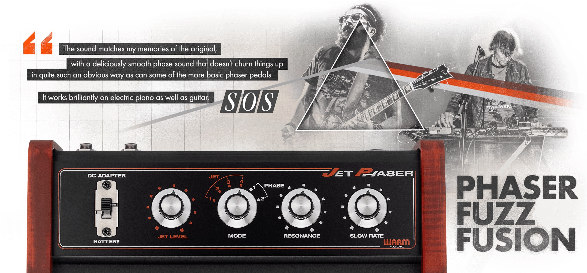 The Jet Phaser is a true reproduction of a popular six-mode phase & fuzz pedal made famous in the 1970s. A robust custom metal enclosure with retro wood paneling encases a vintage-correct circuit with premium components throughout. Jet Phaser accurately recreates the tones of the original pedal that were put on the map by legendary musicians including David Gilmour, Eddie Van Halen, The Isely Brothers, Herbie Hancock and many more.