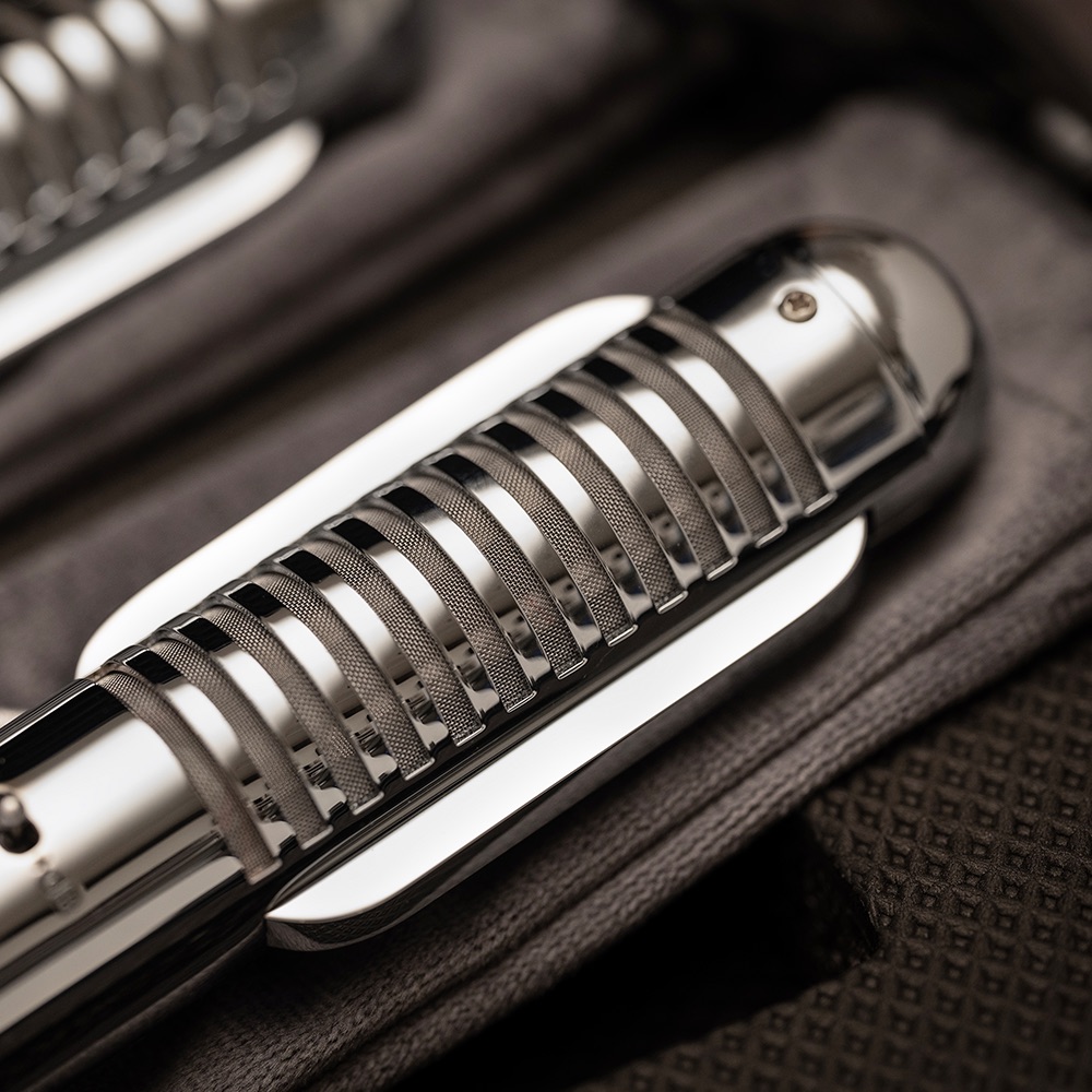 Figure-8 lintmicrofoon, geïnspireerd op de iconische lintmicrofoonontwerpen uit de jaren 50 (Bang & Olufsen BM3)