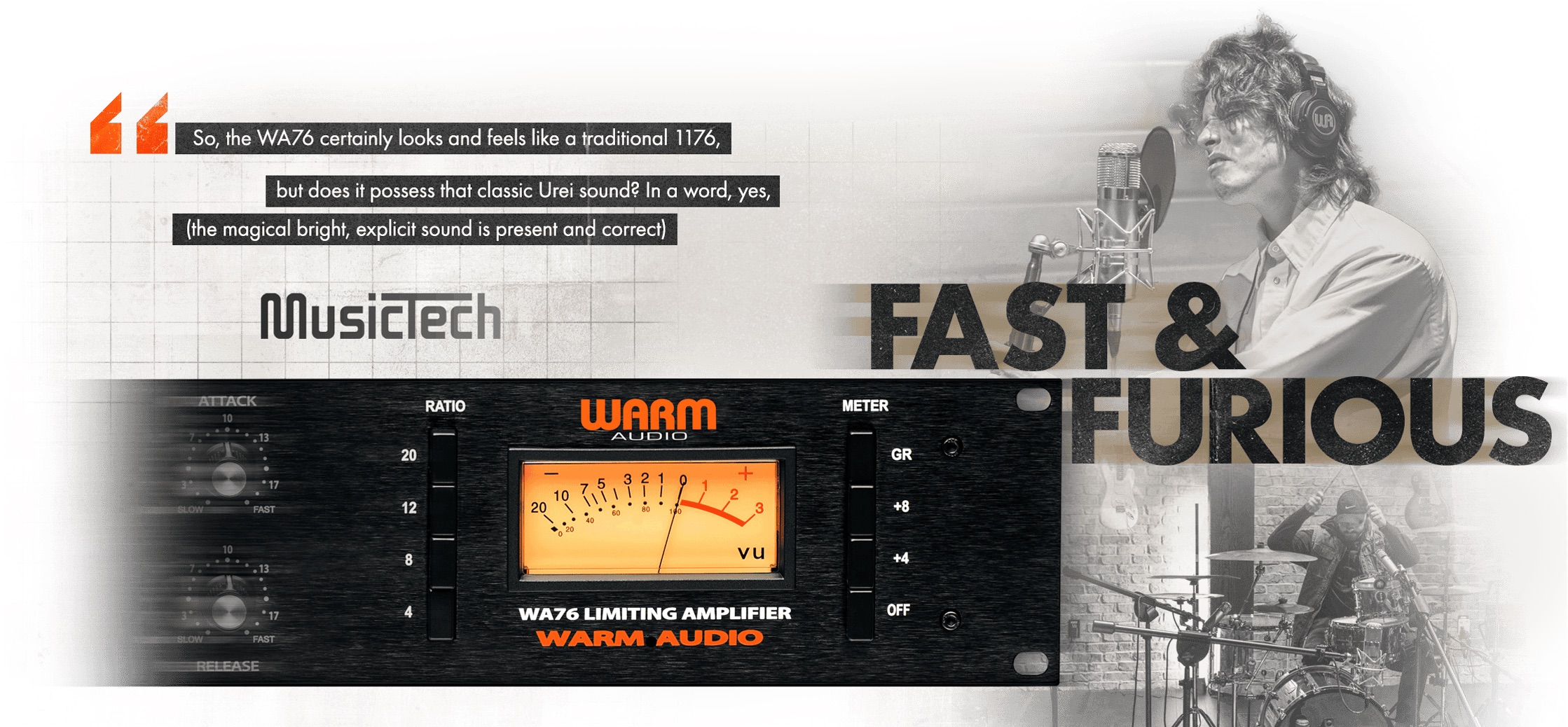 The WA76 accurately reproduces one of the fastest and most powerful studio compressors of all time known for ultra-responsive dynamic control with analog grit. Used heavily on vocals, drums, guitar, bass, and anything in the studio requiring tight dynamics, vintage originals can be heard on legendary recordings by artists like Sting, Jack White, John Mayer, Michael Jackson, Coldplay, Foo Fighters, Timbaland, and many more.