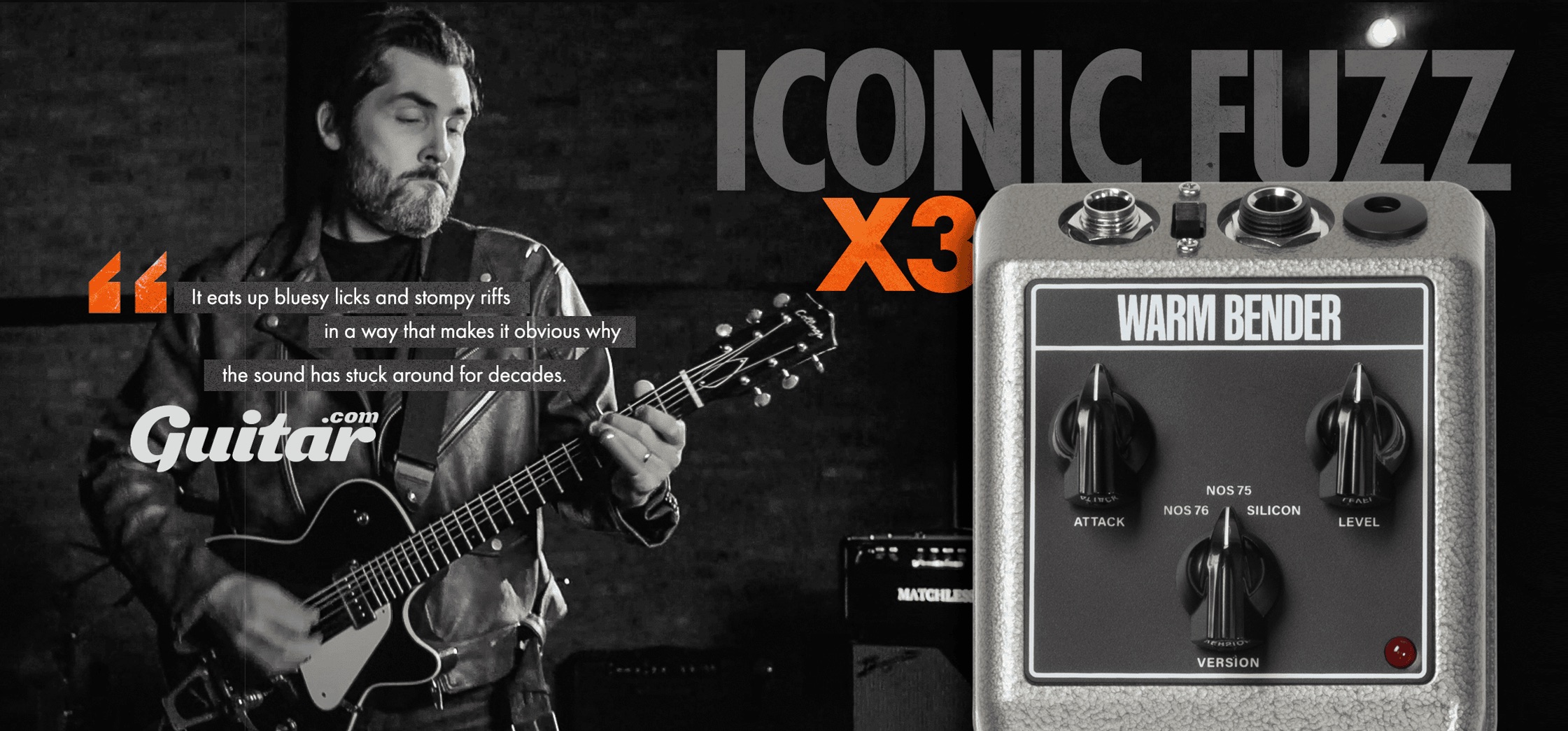 Warm Bender is made with 100% through-hole construction using NOS Germanium transistors (for NOS 75 & NOS 76 settings) and an added SAG control that starves the voltage. Choose between the NOS 76 setting for cutting, present tone, the NOS 75 setting for added bass and warm fuzz, or a proprietary silicon 3-transistor topology circuit for a more modern distortion-like take on this legendary flavor of fuzz. The added SAG control starves the voltage to create that “dying battery” tone with added touch-sensitivity and compression. All of these tonal options from the past plus modern features make the Warm Bender the ultimate Bender fuzz experience.
