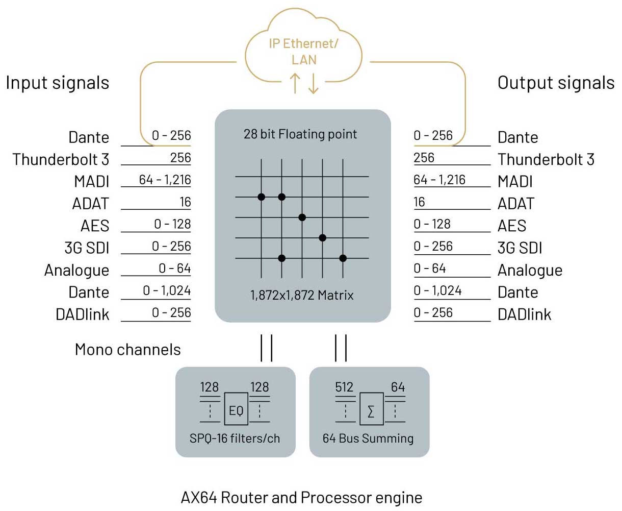 With tons of channels, a wide palette of digital connectivity, built-in SPQ processing, Eucon control compatibility, internal summing engine, Control | Pack and drivers for macOS and Windows 10, it is a pristine digital audio interface by any measure and is suited for just about any application. In short, AX64 is the ultimate modular multi-format interface, which is ready to take on a wealth of tasks in the Post Production, Studio, Live Music and Installed Audio spheres.